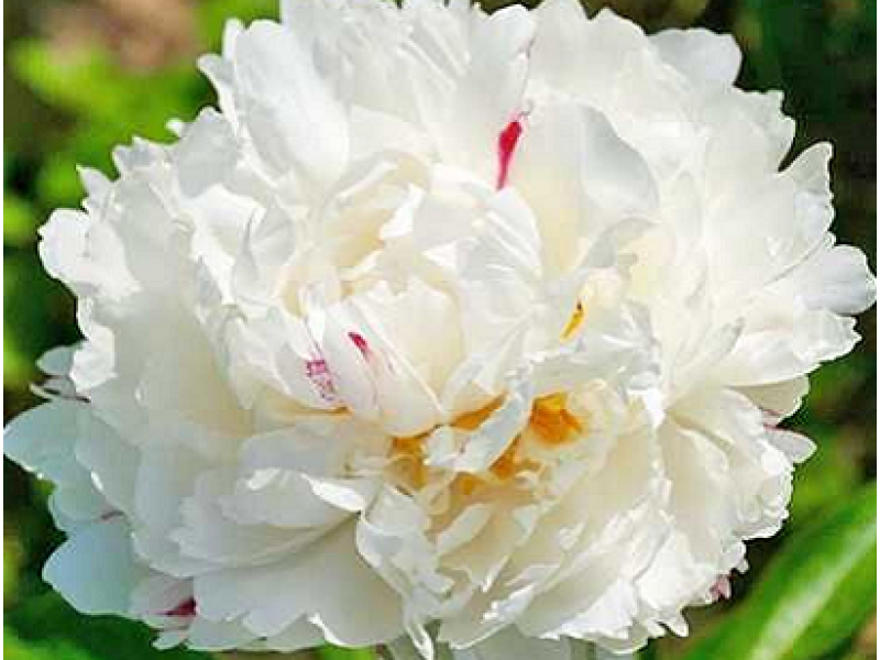 Пион White Lullaby (в переводе «Белая колыбельная») – интересный, полностью махровый, пион среднего периода цветения. Соцветия антично белого цвета имеют легкую красную конфетную полоску и превосходную плотность. Сквозь белые лепестки просматриваются яркие желтые тычинки. Цветок большой, 16-18 см в диаметре, лепестки с несколько с неровным краем, имеет слегка закругленные зазубринки. Высота взрослого куста до 80-90 см. Особенность сорта – чрезвычайно сильный и приятный, сладковатый аромат розы.